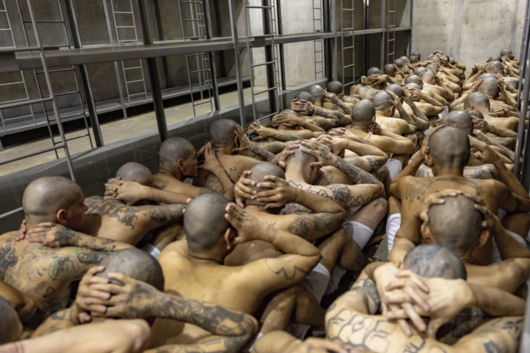 Videot e transferimeve të para treguan qindra burra të lidhur me zinxhirë, gjysmë të zhveshur duke u ngjeshur në formacione të ngushta, trup më trup, përpara se të futeshin në objektin e përhapur. Bukele ndau pamjet në Twitter për të festuar.