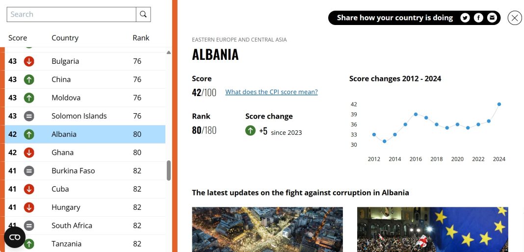 Gjatë dekadës së fundit, Shqipëria ka treguar një përparim gradual në luftën kundër korrupsionit. Në vitin 2012, vendi kishte vetëm 30 pikë, ndërsa tani ka arritur në 42 pikë. Megjithatë, pavarësisht këtij përmirësimi, Shqipëria ende nuk ka arritur të kalojë pragun e 50 pikëve, që konsiderohet një tregues i një sektori publik relativisht të pastër nga korrupsioni.